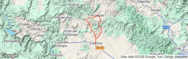 Salida del barrio Los Mases por trazado de carrera por montaña. Se pasa por debajo de los dos grandes viaductos de ferrocarril. Parada en el bar de Albentosa para refrescar y vuelta entre bosque hasta el barrio. Son unos 7 km.