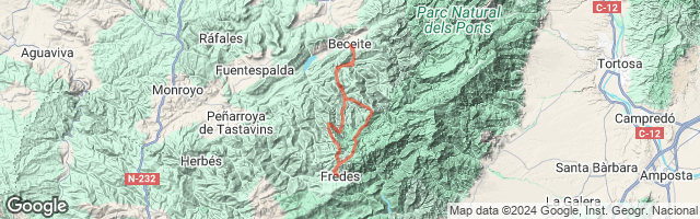 Sale de Beceite y comparte toda la subida con la de Sin sendas hasta San Miguel de Espinalva. Una vez alli cojeremos la Senda del Mas del Ric y a continuacion la senda Gr a Fredes que nos dejara en el mismo Fredes. Seran 8km entre ambas sendas interrunpida solo en 300 metros de tramo de camino. Sera bastante llana aun con alguna pequeña subida y tendiendo a ir para abajo y de dificultad media baja, siempre habiendo algun paso mas complicado en el tramo del Gr . En fredes comeremos todos juntos, Esperemos llegar a la vez, pues la ruta Sin sendas llevara en ese punto mas desnivel acumulado que esta con sendas. La vuelta sera por tosal de 3 reyes y de alli otra vez a San Miguel de Espinalva, para hacer la senda que baja al pantano, de 5 km y pico, que es de dificultad media pero con algunos pasos complicados ( la cual hicimos en la anterior edicion) . Y despues remontaremos al Mas del Coco donde haremos la senda del barranco de unos 2,5 km y que nos deja en el mismo Beceite. Esta ultima se podra evitar yendo por el camino de pantano a Beceite, pero si llegamos a buena hora la haremos.
