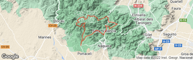 Ruta Circular por la Sierra Calderona que busca visitar sus fuentes mas conocidas por este orden: Potrillos, Deula, San Josep, San Antonio, Marianet, l'Ombria, Barraix, Llentisque, El Poll, El Berro, La Gota, L'Abella y Del Marge.